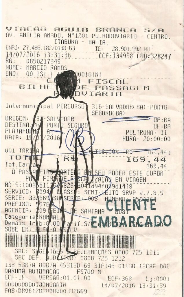 Marcio me contou em entrevista que o primeiro desenho surgiu quando ele viajou para a exibição de uma vídeo-performance sua, lá em 2014, na cidade de Vitória da Conquista. Após ter dois encontros na cidade, ele pensou em imortalizar aquele momento, só que estava sem o seu diário.