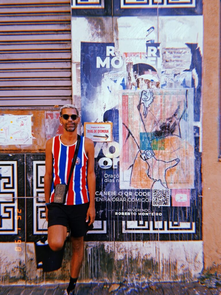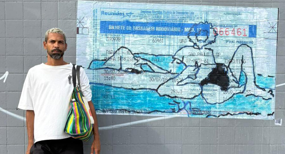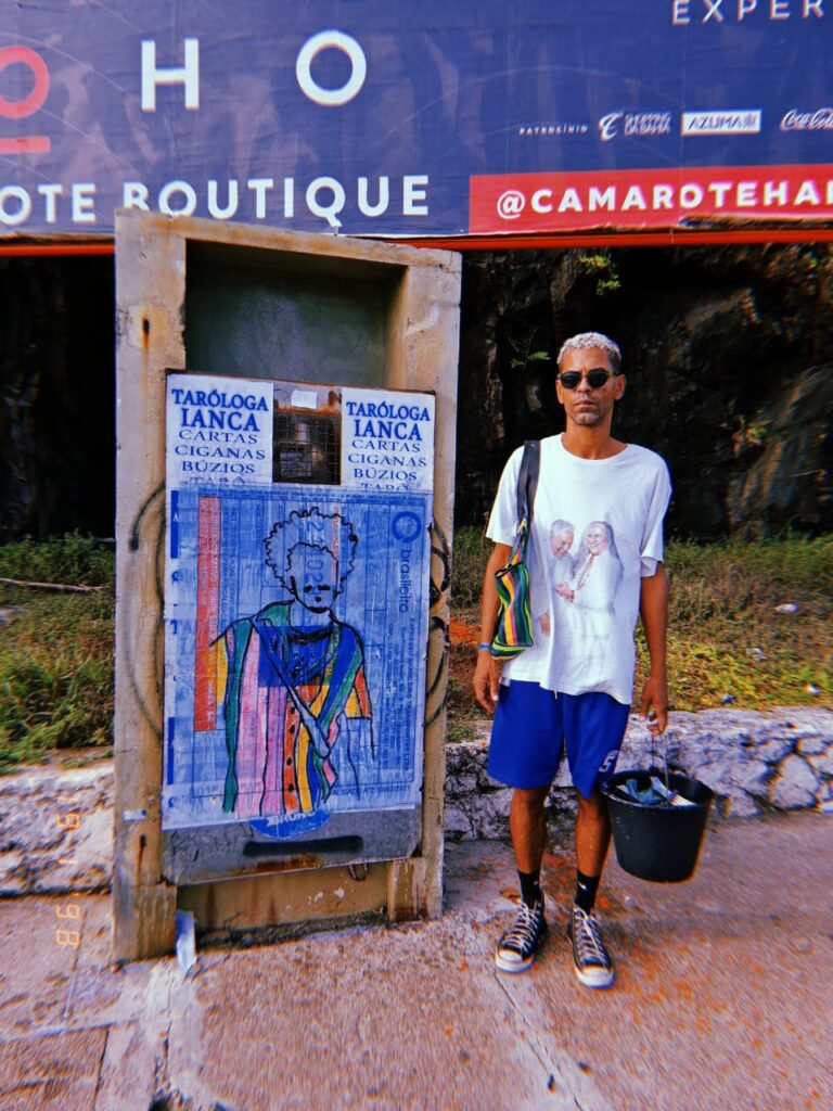 “O diário para mim, sempre foi pensado para a página, já que o livro é o meu suporte favorito. Mas após a exposição individual em Luanda (a convite do Instituto Guimarães Rosa) e após outras exposições — eu também fiquei em exposição no Museu de Arte da Bahia — eu fiquei muito instigado a pensar essa dimensão da parede. É um outro tipo de escrita, esse desenho ampliado, são modos distintos. Há uma escala diferente quando você sai da página para a parede. Eu acabei a série em 2024 durante a residência da FAAP, mas eu não tinha me tocado que eu tinha terminado a série. Nesse movimento meu de fechar a série e entender que eu estava fechando essa pesquisa de 11 anos, eu senti necessidade de fazer um gesto de fechamento da série. Um gesto para mim e não para outros, pensando que agora eu vou me esvaziar e pensar outras coisas. Então eu pensei em colar 7 lambes na rua, pensando 7 como um número cabalístico — 7 é o número de Exú, que abre caminhos — e imaginei 7 lugares na cidade de Salvador que tivessem associação com os desenhos e com as pessoas que aparecem nos desenhos também. Mas eu também pensei muitas outras coisas a partir desse gesto.“