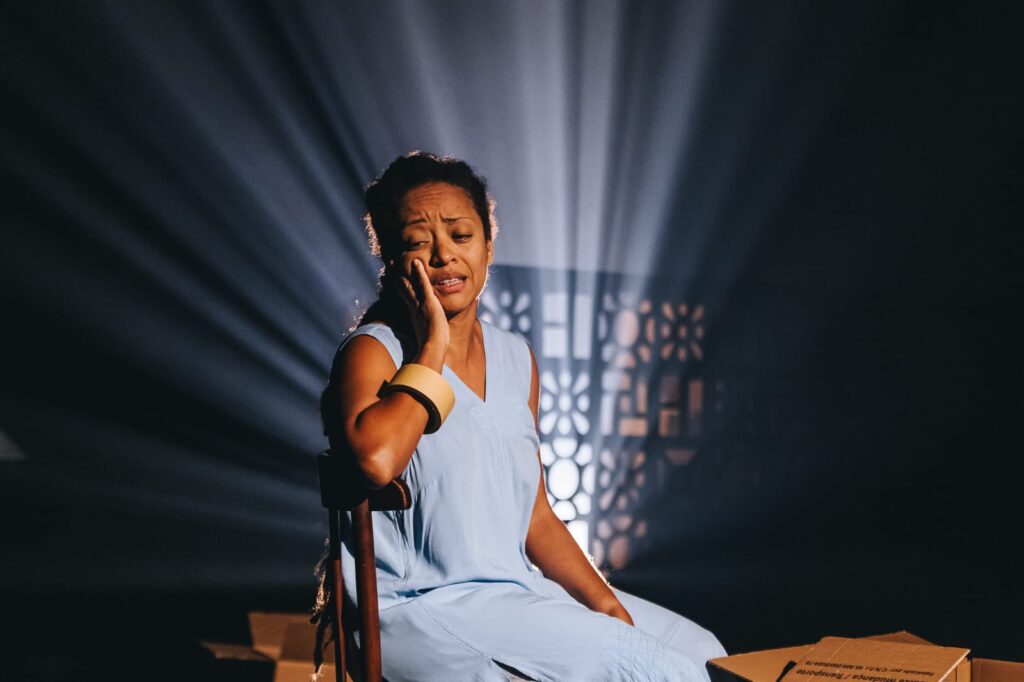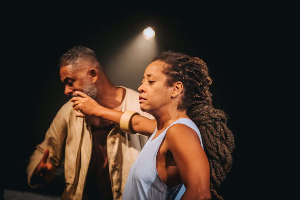 Abro um parênteses para destacar o impressionante trabalho de atuação tanto de Mônica quanto de Antonio, embora, sabemos, o grande desafio de Antonio seja contracenar com uma atriz como Mônica Santana. No palco, ela domina, é hipnotizante. É um trabalho que passa pela dimensão do corpo, numa atuação que se entrega de corpo e alma. Outro ator poderia simplesmente sumir ao lado dela, mas Antonio Marcelo também brilha em momentos emocionantes. Isso só é possível porque o texto convoca esse quebrantamento, afastando os personagens de uma superficialidade previsível e colocando-os como seres complexos diante do público. Esse é o grande mérito do espetáculo como um todo, aliás.